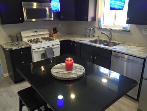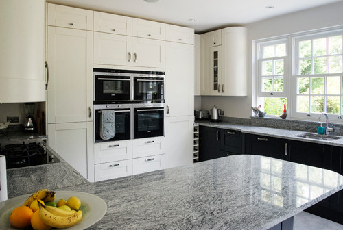The major color combinations are grey in this stone. Black and white create a good contrast with dark espresso color cabinets. I just want to show you that Viscount White granite with grey cabinets too, but it looks more appealing with whites. The floor is light grey porcelain tile to match the rest of the granite kitchen.