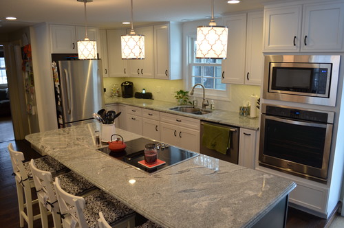 Small cozy kitchen with an island equipped with a slide-in range in it. Viscont White granite countertop can go with white cabinets no matter what is the other surrounding colors.